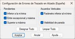 En esta opción podemos personalizar la configuración de errores de la normativa en alzado. Al ejecutar el comando de “Rasantes > Comprobar Normativa”, MDT sólo mostrará aquellos errores que se encuentren activados en esta opción. Si existe algún error en la comprobación de la normativa y lo tenemos desactivado, éste no aparecerá en el listado final.