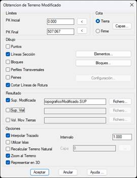 Este comando permite obtener el estado final de la superficie del proyecto, después de ejecutar el movimiento de tierras. Lo primero es seleccionar un fichero de segmento, o un fichero de eje y un fichero de perfiles transversales, generalmente generados con el comando Transversales > Generar Terreno Modificado. Seguidamente aparece el siguiente diálogo: