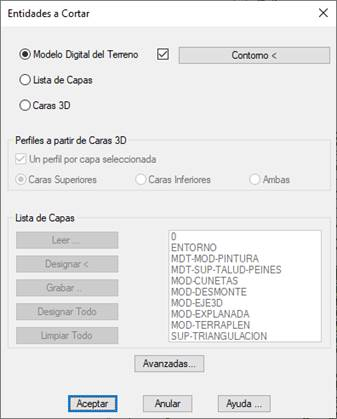 Al seleccionar esta opción se habilita el botón Avanzadas, de forma que al obtener perfiles a partir de las capas seleccionadas en el diálogo que se muestra a continuación, se incluirá la información de las entidades asociadas a dichas capas, interpolando las cotas de las mismas.