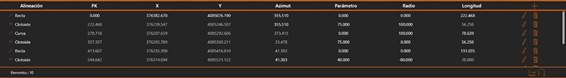 · Radio: En caso de curvas o clotoides, el valor del radio. En otro caso, siempre será 0. El signo determina si la curva es interior o exterior. Si se hace doble clic sobre él se puede editar.