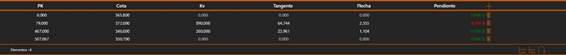 · Pendiente: El valor de pendiente del nodo. Es la pendiente entre el nodo y el siguiente. La dirección de la pendiente viene determinada por el signo. La pendiente positiva se mostrará con un texto verde, la negativa con un texto rojo.