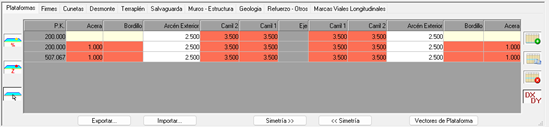 Adicionalmente, disponemos de cuatro botones los cuales nos permite realizar las siguientes operaciones sobre la definición de la plataforma a lo largo de los pks.