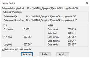 Esta opción nos va a permitir visualizar las características de un longitudinal dibujado, adicionalmente, se dispone de la posibilidad de indicar si el perfil seleccionado se actualizará de forma automática en el caso de modificar la superficie o eje a partir del cual se generó.