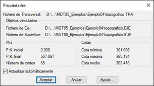 Esta opción nos va a permitir visualizar las características de un transversal dibujado, adicionalmente, se dispone de la posibilidad de indicar si los perfiles seleccionados se actualizarán de forma automática en el caso de modificar la superficie o eje a partir del cual se generaron.