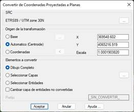 Esta opción realiza la operación inversa al comando Planas a Proyectadas, es decir, convierte de coordenadas proyectadas a planas, aplicando un factor de escala inverso al de la proyección en el origen seleccionado.