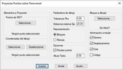 Al ejecutar el comando nos solicitará seleccionar el eje de cualquiera de los cortes sobre los que quiere proyectar los puntos, seguidamente el eje y finalmente nos aparecerá la siguiente ventana en la cual estableceremos la configuración de dibujo.