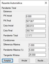 Pendiente Máxima (%) : Indicamos la pendiente máxima / mínima de la rasante a crear.
