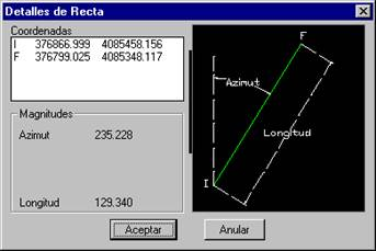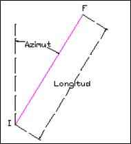 La recta está definida por sus puntos inicial (I) y final (F). El azimut inicial y la longitud se calculan automáticamente, y se indican en el diálogo que se muestra pulsando el botón Detalles en el comando Editar Alineación.
