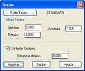 Controlar Solapes: Si activamos esta casilla estableceremos un control de solape para los textos que se rotulan en los elementos de guitarra. Según la Distancia Mínima introducida MDT no dibujará ningún texto con respecto al anterior que se encuentre a una distancia inferior a la especificada.