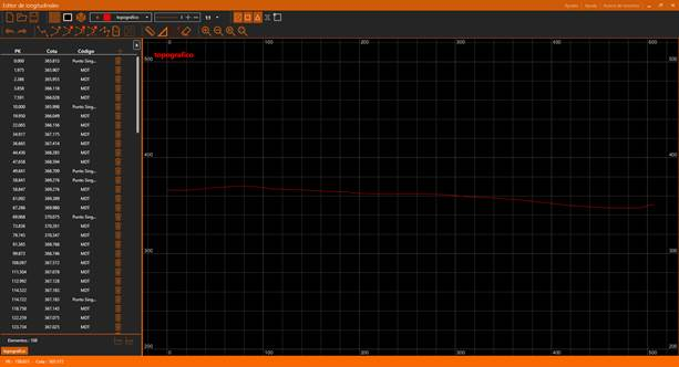 Este comando nos permite editar un perfil longitudinal del terreno (ficheros lon) así como trabajar con ficheros de longitudinales de puntos (lns) de los que nos podremos valer para extraer un longitudinal a partir de dichos puntos y hacer un ajuste fino mediante las herramientas que nos provee la aplicación.