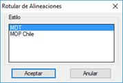 Este comando tiene por objeto la representación cuadros que contengan la información de los elementos singulares y representativos de cada vértice de una alineación en planta (eje). El programa solicita que se seleccione un eje del dibujo, y seguidamente aparece una ventana en la que se puede elegir el estilo con que se rotulan los cuadros de alineaciones.Una vez seleccionado el estilo, el programa solicita las coordenadas donde insertar el primer elemento de la rotulación. También se puede cambiar la escala, eligiendo la opción apropiada en la línea de comandos. La distancia desde las coordenadas introducidas y el eje, se utilizara como separación respecto al eje, para el resto de los elementos que se rotulen.