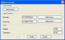 Como se observa en el diálogo, hay que especificar las capas que contienen las curvas de nivel. El programa cambiara las entidades a las capas Normales o Directoras, distinguiendo unas de otras según la cota de la curva sea un múltiplo del número introducido en el parámetro Múltiplo. Además, el parámetro Tolerancia permite seleccionar aquellas curvas que se encuentren por encima o por debajo de la cota múltiplo de la tolerancia indicada.