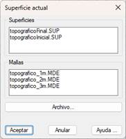 Si la superficie que vamos a establecer como actual, se encuentra en la misma carpeta, la seleccionamos en la ventana y presionamos el botón Aceptar. En el caso de que el fichero de superficies o malla se encuentra en otra carpeta, presionamos el botón Archivo… y seleccionamos el mismo según la carpeta en la que se encuentre.