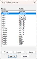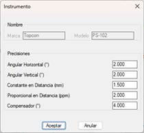 Mediante el botón Tabla de Instrumentos se puede acceder al menú que permite configurar los valores que afectan principalmente a las desviaciones estándar de las observaciones, usadas fundamentalmente en los métodos de ajuste por mínimos cuadrados.