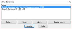 Al ejecutar este comando el programa nos presentará una ventana con las tablas de peraltes existentes en configuración según el país seleccionado en configuración.