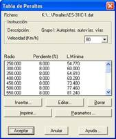 La tabla podrá ser opcionalmente modificada o personalizada dependiendo de las características del trazado y la velocidad asignada al mismo. Inicialmente nos solicita el fichero de peraltes y a continuación se muestra un diálogo con la configuración del mismo. Cada una de las tablas de peraltes pueden tener diferentes valores dependiendo de la velocidad del trazado. Seguidamente se describe las características del diálogo.