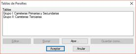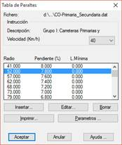 29.13.4. Tabla de Peraltes Al presionar este botón accedemos a la configuración de las distintas tablas de peraltes según la normativa de carretera seleccionada. Existe la posibilidad de insertar, editar y borrar las tablas de peraltes existentes.