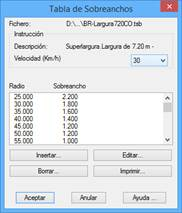 La tabla podrá ser opcionalmente modificada o personalizada dependiendo de las características del trazado y la velocidad asignada al mismo. Inicialmente nos solicita el fichero de sobreanchos y a continuación se muestra un diálogo con la configuración del mismo. Cada una de las tablas de sobreanchos pueden tener diferentes valores dependiendo de la velocidad del trazado. Seguidamente se describe las características del diálogo.