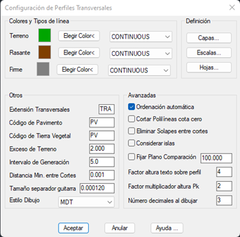 29.11. Transversales Permite modificar los valores de los parámetros que afectan a los comandos de obtención y dibujo de perfiles transversales.
