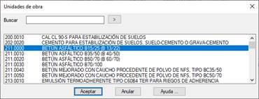 Asignación de la unidad de obra principal, si presionamos el botón (…) nos aparecerá la siguiente ventana en la cual nos aparecerá las distintas unidades de obras disponibles según la base de datos BC3 seleccionada (ver Configuración > BIM). Seleccionamos la unidad de obra a asignar al material de firme seleccionado.