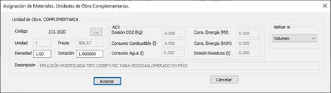 Una vez seleccionada, se rellenará automáticamente la ventana principal como se puede ver en la captura anterior. Igualmente si esta unidad de obra tuviera una unidad de ciclo de vida asignada, se cumplimentaría automáticamente.