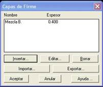 Para realizar esta definición, al editar las propiedades del vector, nos aparecerá una ventana en la cual si presionamos el botón “Capas de Firmes” podremos especificar las características de cada una de las capas de firme para el vector en cuestión.