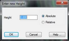 The value of the new height desired is entered in Height and whether the height adjustment is to be Absolute or Relative, that is to say, whether it is to be changed to the height actually entered or to be increased with respect to the existing height.