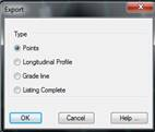 Points File: All the coordinates of all the points on the list are exported to a points file. When the dialog box is validated, the Export Points command is automatically executed. For further details, see the Surveying Points section.