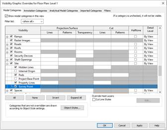 We then look for the Site property and activate Survey Point: