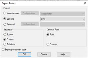To export this point cloud to a TXT or CSV file in X, Y, Z format separated by commas, use the MDT > Points > Export command and add the TXT extension and disable the option to Export points with a code when saving the file.