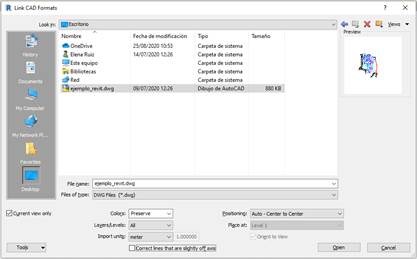 Under the CAD format link options, check the “Current view only” box; place meters under Import Units and “Auto – Center to center” under Positioning.