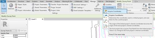 We then transfer the DWG coordinates to the Revit project, in the Manage > Project location> Coordinates>Acquire coordinates tab asks us for a linked project and we select it by clicking on the drawing.