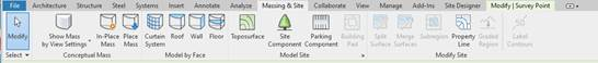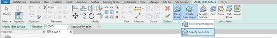 Once the project is located in the desired coordinates, we will be able to obtain a topographic surface from the import of a points file in TXT or CSV format. This is done using the Massing & Site tab > Model site > Toposurface tab: