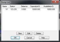 When inserting a new one it will request the station location for the dump with regard to the project alignment, the alignment displacement and the dump’s capacity in cubic meters.