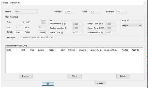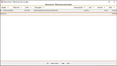 This command enables us to calculate a budget for the execution of the selected elements. Each works unit will have a price assigned per unit, and the calculation will be made based on this price in accordance with the measurement of the element in question.