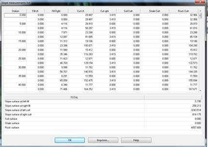 As with the previous command, in these cases we can generate a list of the length of the slopes or the surface of the same. When selecting surfaces, the list may consist of developed or ground plan surfaces in the cut and fill slopes of the road of the segment selected.