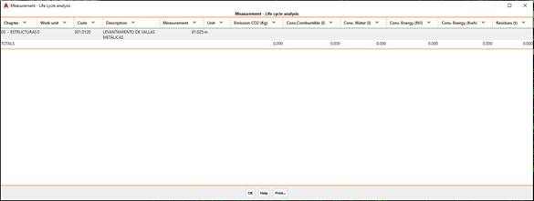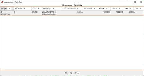 Once the dialogue box has been checked, the list with the estimate for both each works unit and the total will be displayed.