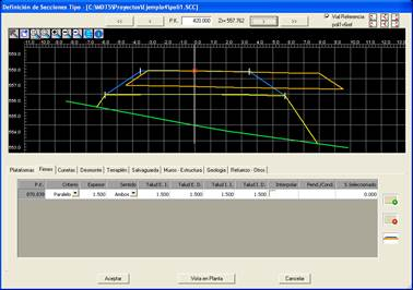 Botones para el desplazamiento a lo largo de cada uno de los pks, en el caso de seleccionar un fichero de secciones, al no existir información del terreno natural disponemos del siguiente botón con el cual simularemos los transversales con el objetivo de conseguir una simulación real de la sección.