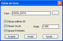 A continuación el programa solicita un punto inicial para el recorrido, y dibuja la polilínea que representa el recorrido de la gota. Activando la opción Dibujar Circulo se puede distinguir mas fácilmente el punto inicial del recorrido, porque el programa dibuja un circulo en esa posición. Con la opción de Agrupar Entidades, se agrupan la polilínea y el circulo dibujados, de forma que se seleccionan ambos automáticamente al seleccionar una de las entidades. Así se pueden eliminar ambas fácilmente.