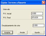 Este comando nos permite crear una rasante paralela al terreno representado por un perfil longitudinal ya existente en el dibujo. Inicialmente se nos requiere que seleccionemos el terreno (por defecto polilínea verde en capa PERLONG-TERRENO). Ahora el programa solicita los PK Inicial y PK Final (por defecto 0 y la longitud del perfil, respectivamente). Por último se nos pide el Desplazamiento de Cota, pudiendo introducir valores menores que cero en caso de equidistancia hacia abajo, o mayores de cero en caso de equidistancia hacia arriba.