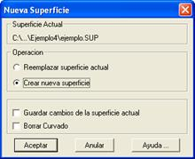 En caso de que no exista una superficie actual, o se haya escogido en la ventana anterior la opción de Crear nueva superficie, el programa solicita un fichero donde guardar la superficie. A continuación aparecen la ventana de creación de superficie: