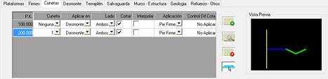 A la izquierda se introducen los datos de la cuneta en el pk correspondiente y en la derecha tenemos una vista previa de la cuneta que en ese momento se está asignando.