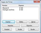 Capas: Mediante esta opción podremos asignar distintas capas de firme a la zona de refuerzo. Si existe esta asignación, al calcular el volumen de capas de firme aparecerá el cálculo de los materiales correspondientes. En caso de nos existir asignación de capas, aparecerá como material en el cálculo el concepto “Refuerzo”.