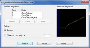 Al presionar este botón editamos la asignación de talud de desmonte designada. Inicialmente nos aparecerá la siguiente ventana: