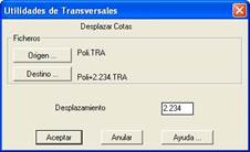 Esta opción nos permite modificar la totalidad de las cotas de un fichero de perfiles transversales. Marcando en la ventana de selección el nombre del fichero a procesar, introducir el desplazamiento relativo de cota (negativo o positivo).