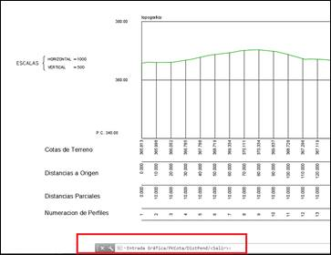 Esta otra forma de definición presenta en primer lugar el mismo submenú que la opción PK y Cota. Una vez introducido el primer dato (Pk) el programa solicita la cota, presentado por defecto la del terreno en el punto deseado. Especificado así el primer punto, se nos requiere la Distancia de la alineación, que parte desde el primer vértice hasta el actual. Introduciendo dicha distancia el programa solicitará su Pendiente, y creará el nuevo vector de la alineación, partiendo del anterior y con la distancia fijada. El programa continuará solicitando distancia y pendiente repetidamente, hasta que demos una respuesta nula. Una vez definida la rasante, el programa hace suyo el estado de alineaciones, acoplándolas a los parámetros de la proyección ortogonal del perfil.