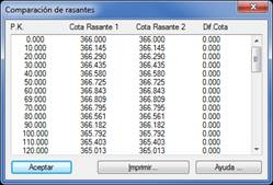 Este comando va a permitirnos obtener un listado en el que se comparan dos rasantes previamente seleccionadas. Al ejecutar esta opción nos aparecerá la siguiente ventana donde estableceremos los criterios bajo los cuales deseamos realizar el listado: