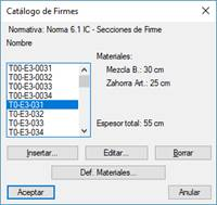 Al definir un nuevo conjunto de capas de firme, si tenemos seleccionada la Normativa Española, el programa nos mostrará el Catálogo de Firmes. De esta forma seleccionaremos el que se adapta al vial que vamos a definir.