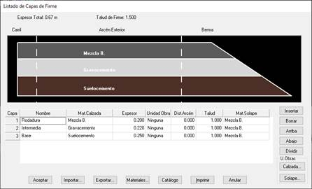 Las capas de firme se definen desde la parte superior hasta el contacto con la subrasante. Existen diferentes posibilidades para el tratamiento y gestión del diálogo. Existe la posibilidad tanto de Importar como Exportar, así como de Imprimir las características detalladas de cada uno de ellos.