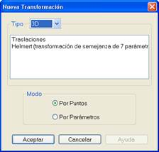 3D: Transformaciones de 3 dimensiones, que incluye traslaciones en X, Y, Z y la clásica Helmert de 7 parámetros.